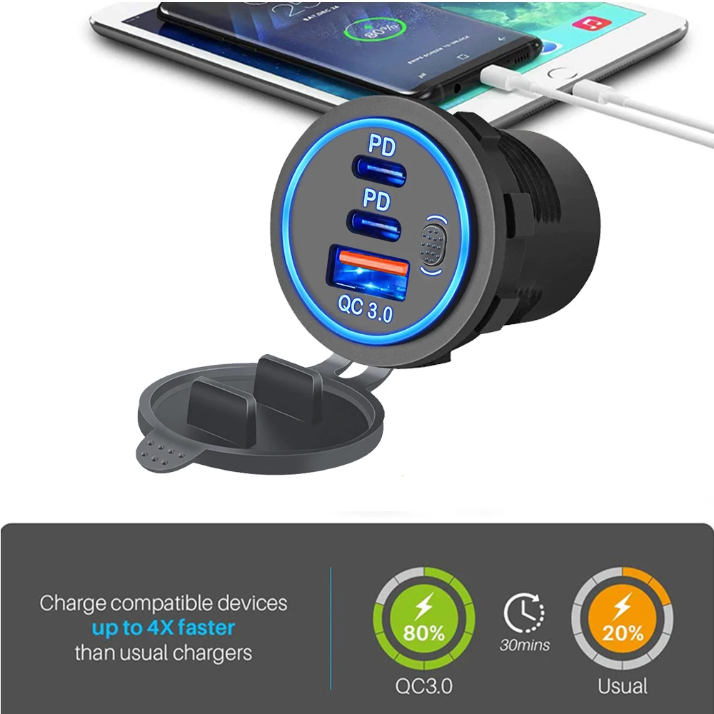 78W Dual PD QC3.0 Car Charger Socket Accessory Waterproof Quick Charge 3.0 Socket Power Outlet for 12V/24V Motorcycle Truck Boat
