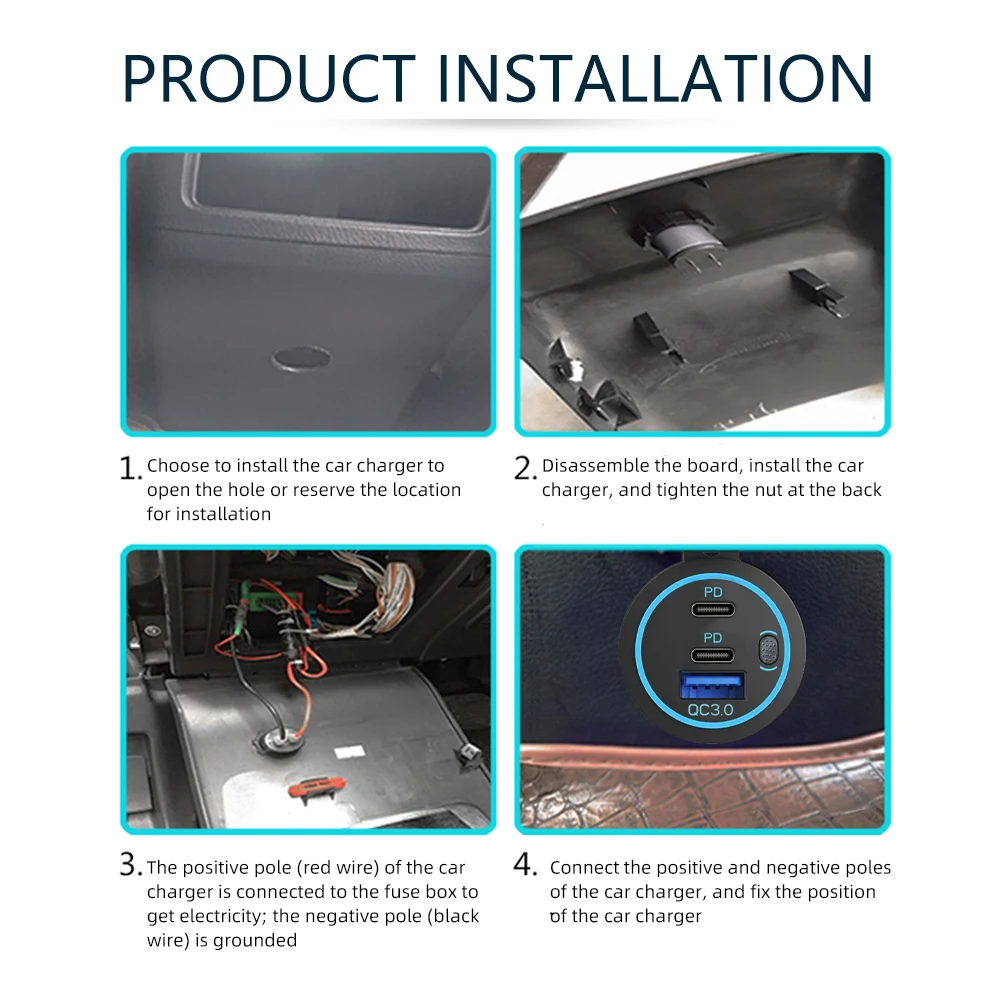 1. Select the installation position of the car charger to open the hole or keep the installation position.