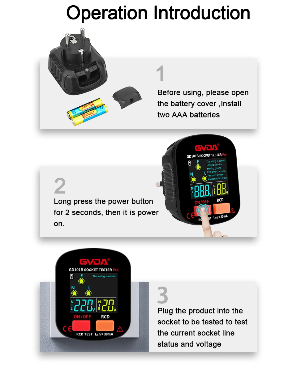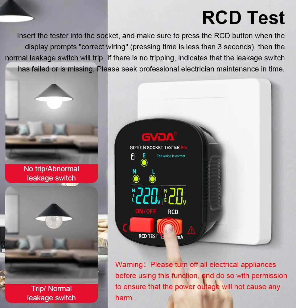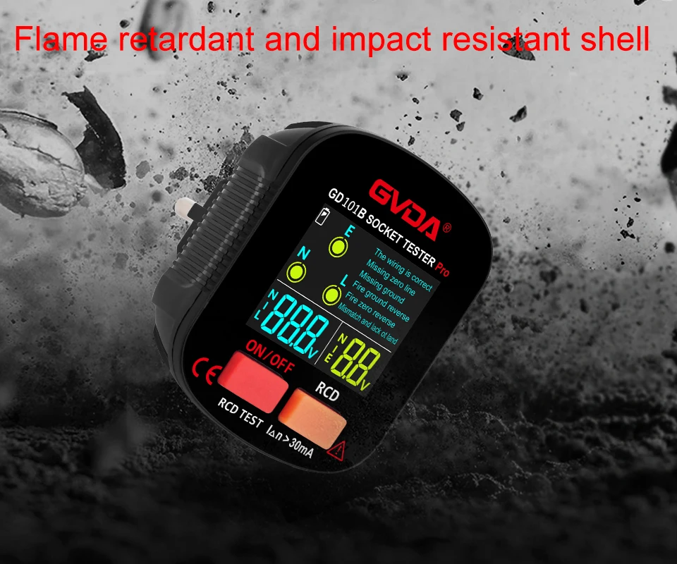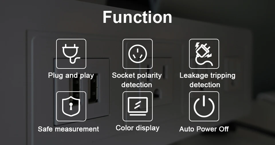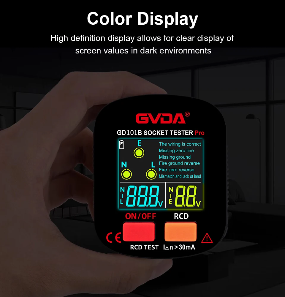 This socket tester is safe and easy to use, it has the following features: Color display,Socket polarity detection,Leakage tripping detection, Auto power off